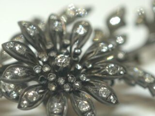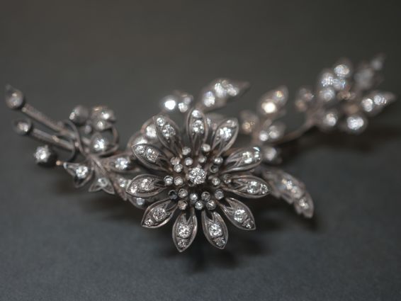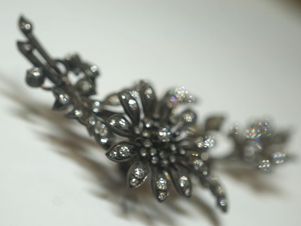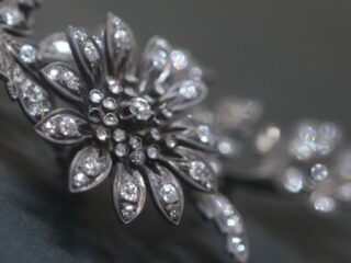 時代を経て渋さの魅力を感じる銀の台に,輝きを放つダイヤモンドの花びらの繊細な揺れが魅力です。