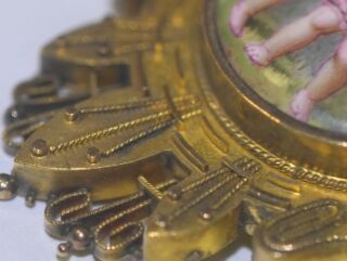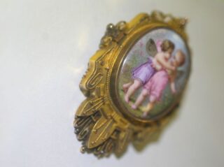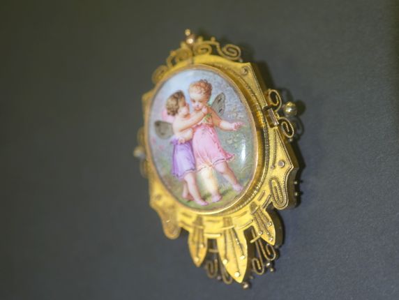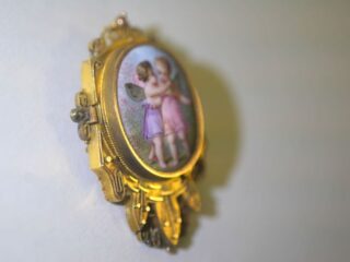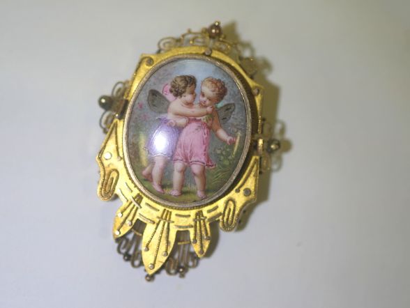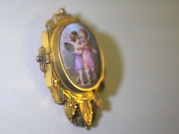 真ん中にはエナメルを用いて,天使がお花の首飾りをもう一人の天使に飾っています。