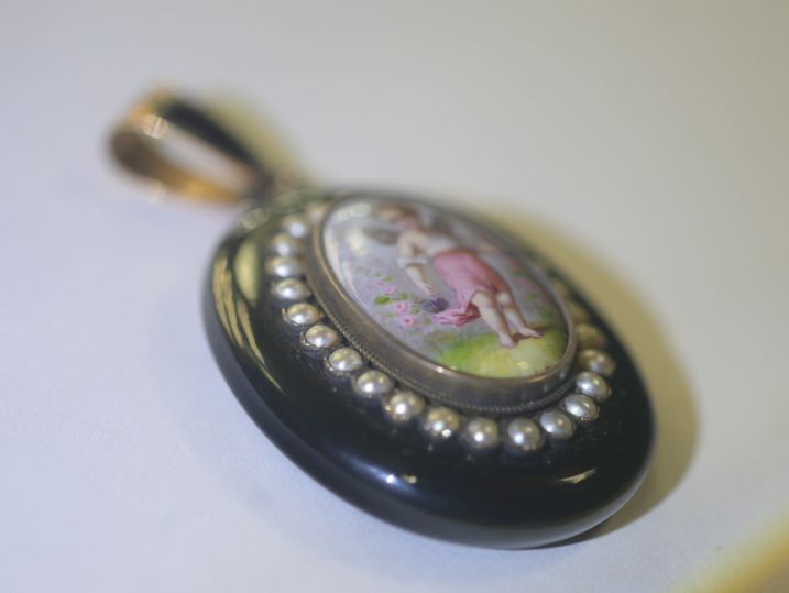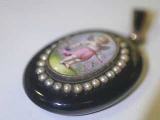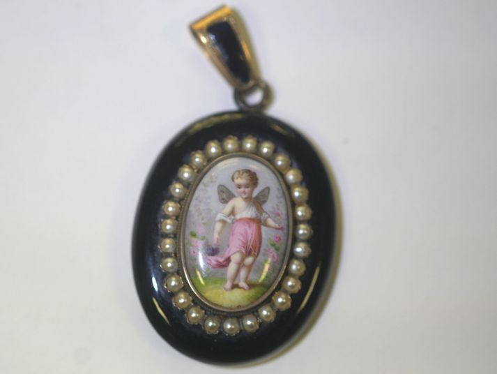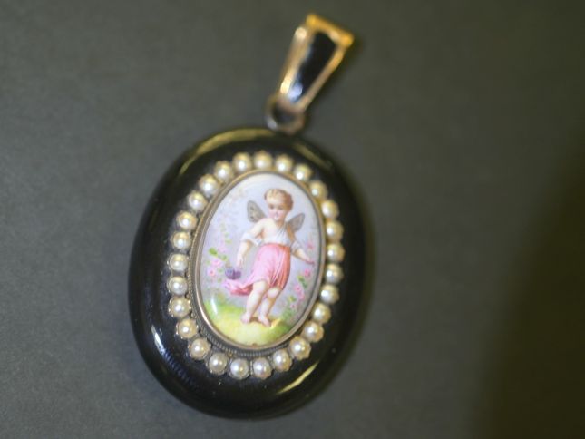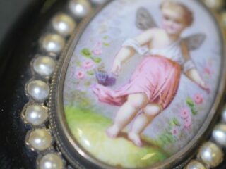 エンジェルの透き通るように輝く肌や,時代を感じさせる形と色のシードパールがマッチして,可愛さの中にもグレードの高さを感じさせ, エナメル画をいっそう引き立てています。