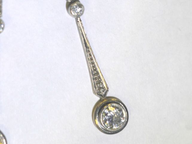 左右の垂れ下がり方に極端に差をつけてなくて,長さ37ミリと35 ミリです。 ダイヤモンドとダイヤモンドの間には,プラチナとゴールドを張り合わせた薄い板のナイフエッジになっていて,揺れる作りになっています。