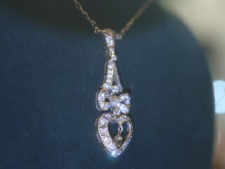 ハートの中に、下がっているダイヤモンドが揺れるようになっているのも気が利いていますし、リボンの中心部から下がるハートは、動くようになっているのです。