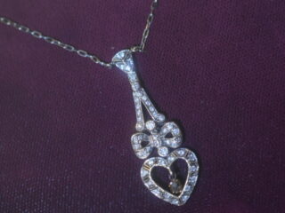 ハートモチーフとリボンモチーフのオープンワークのデザインの華麗さ、 軽やかな繊細さが大変魅力的で、丁寧な作りをしているアンティークジュエリーです。
