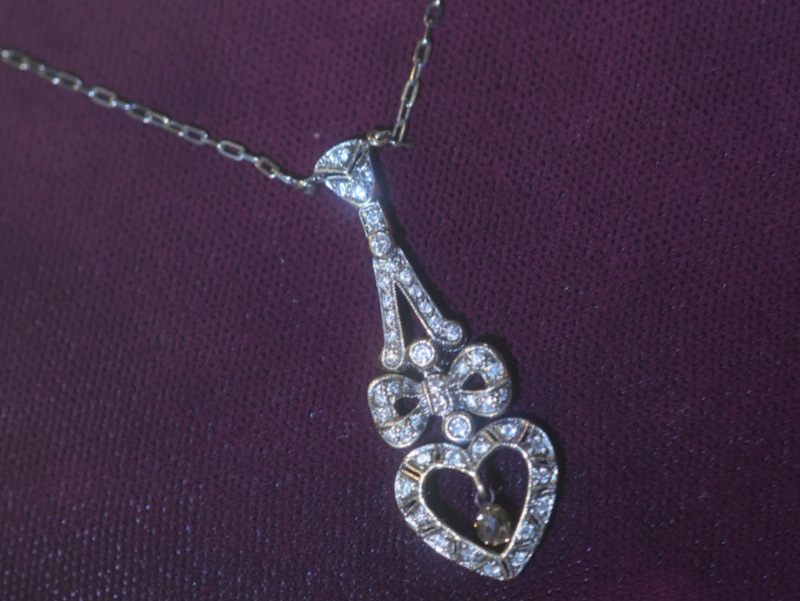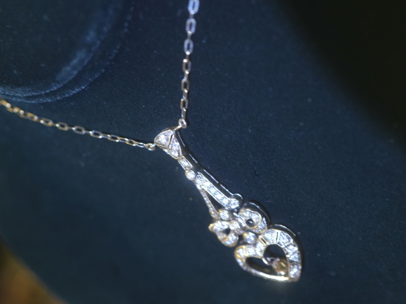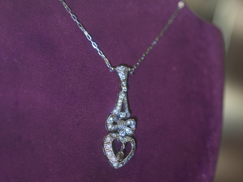 質の良いダイヤモンドと華麗なオープンワーク、ダイヤモンドの輝きによって、大人の女性も楽しめるハート&リボンモチーフのアンティークジュエリーです。