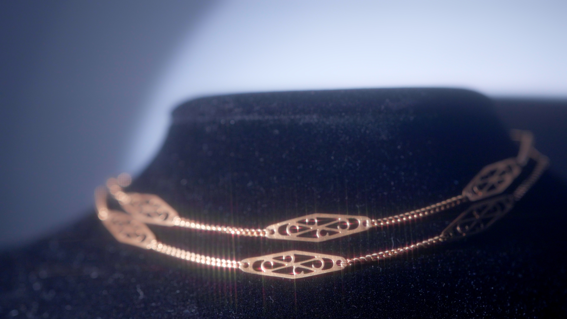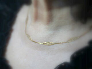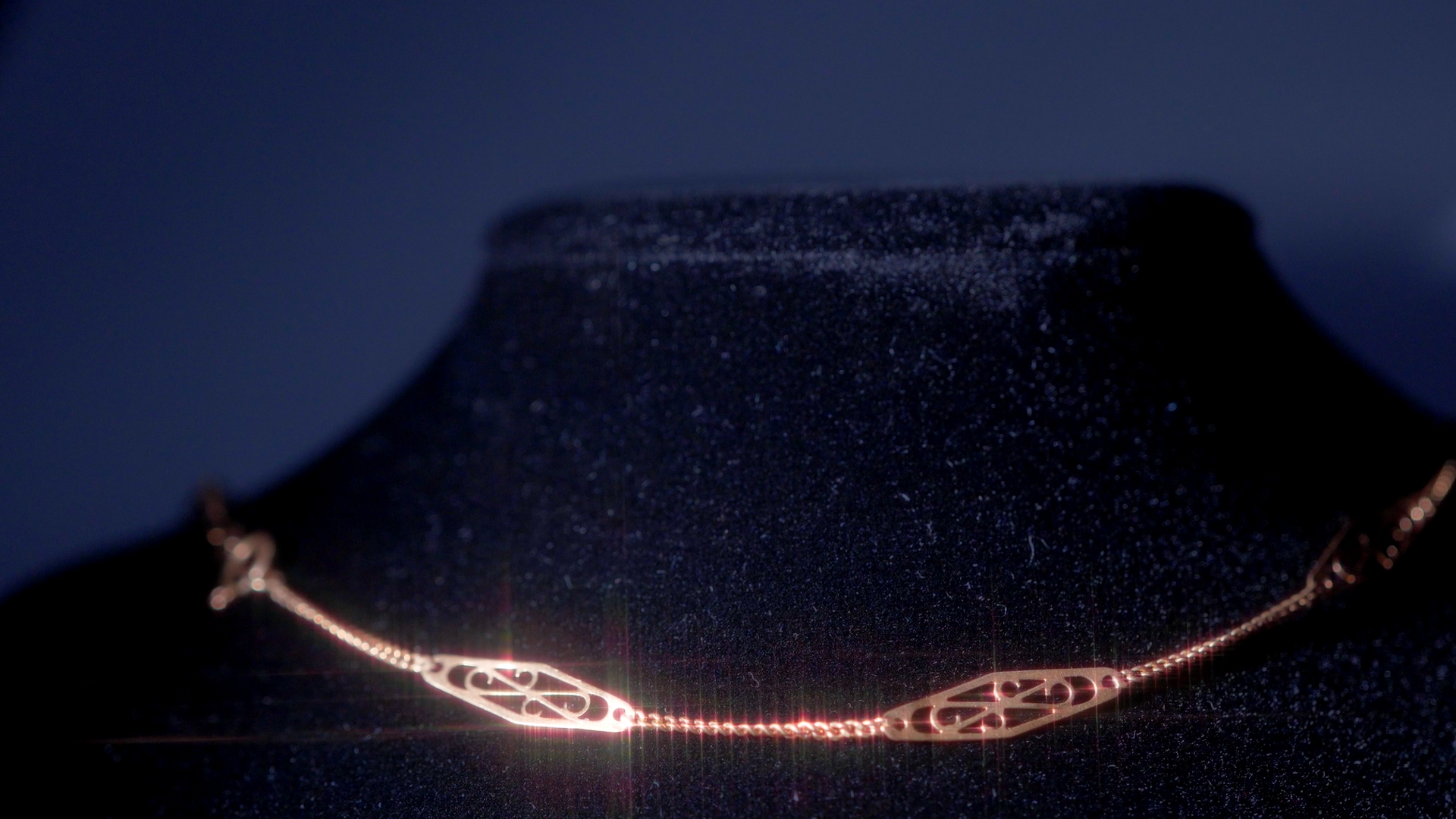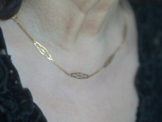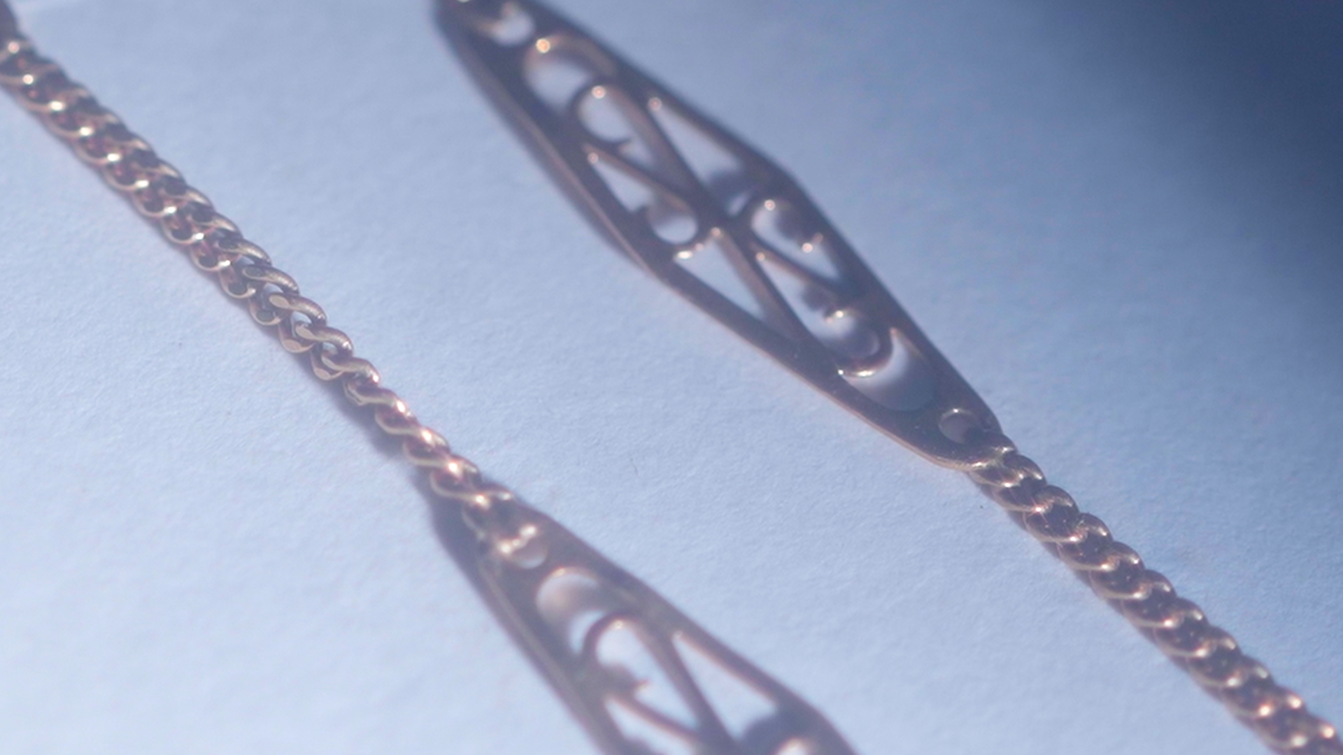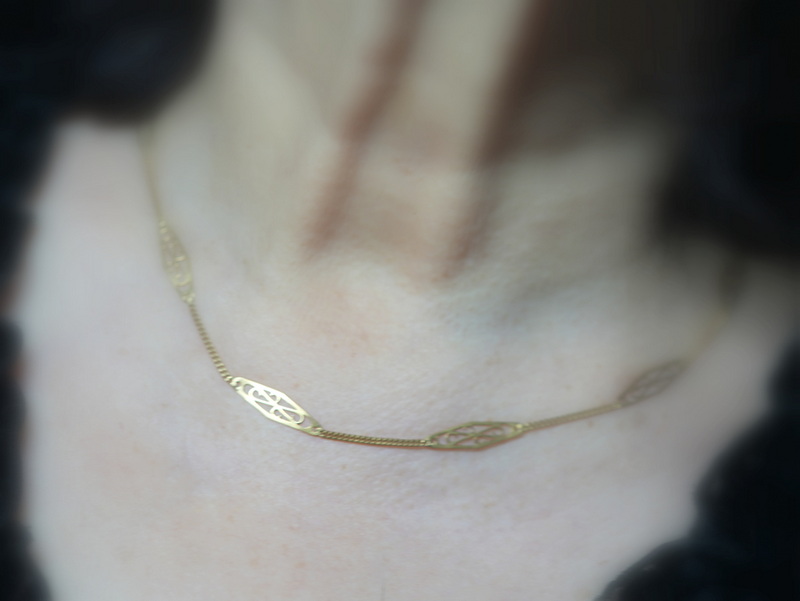 ゴールドのチェーンとフィリグリー細工、27のパーツをリズミカルに交互につないだもので、