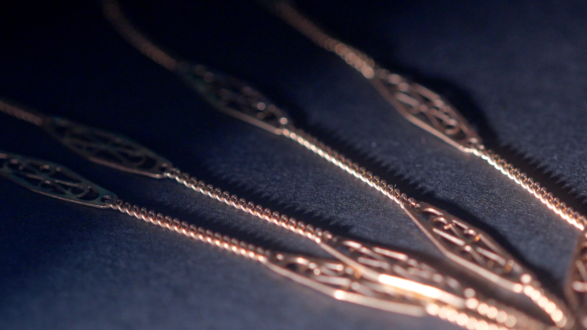 全て宝飾師によりハンドメイドで作られ、レースのようなフィリグリー細工の18金製です。