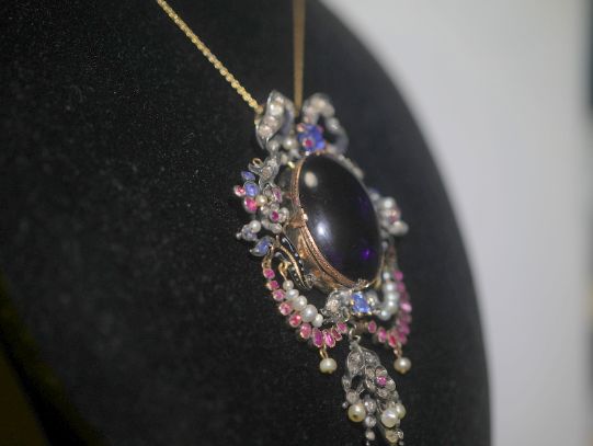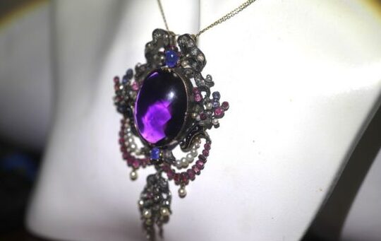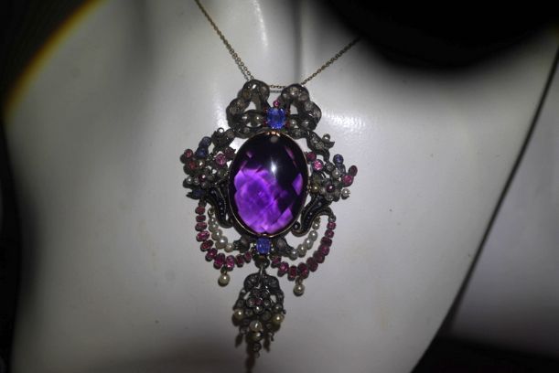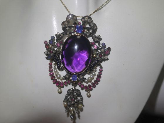美しいカボションカットアメジストと立体的な金細工が素晴らしいペンダントです。