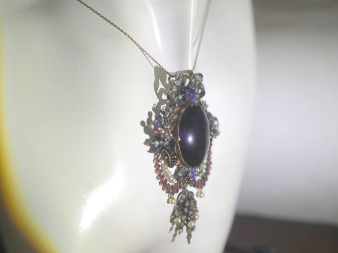 ビクトリアンジャルディネッティペンダント|ローズカットダイヤ&ルビー&サファイア&アメジスト&ブラックエナメル&真珠(鑑定書付)【商品番号p51】
