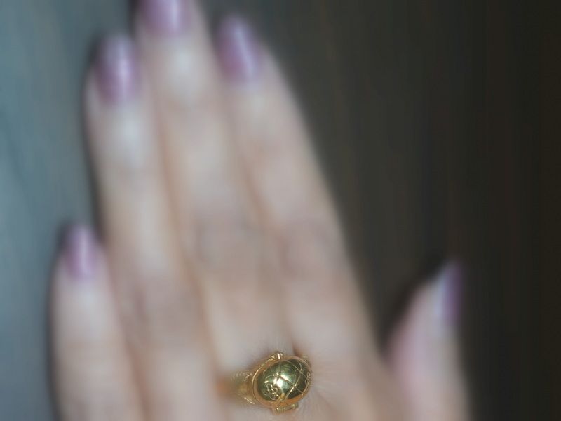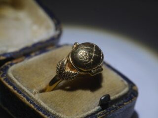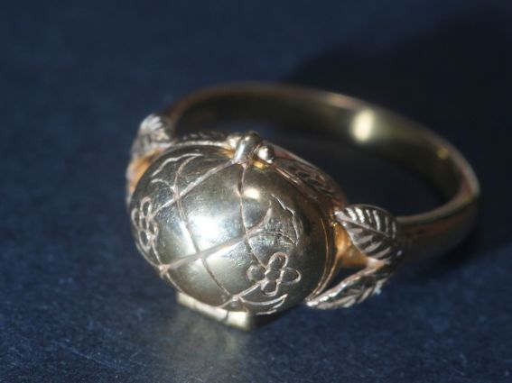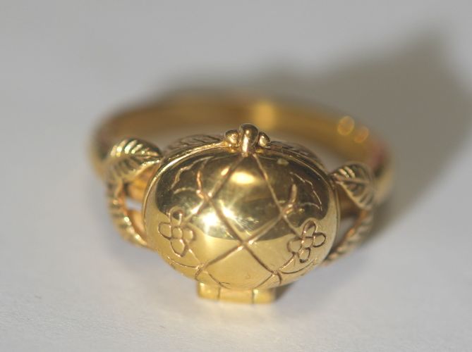繊細な彫金細工が魅力で、ロケットペンダントのように開閉できる指輪のリングです。