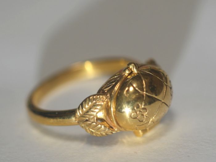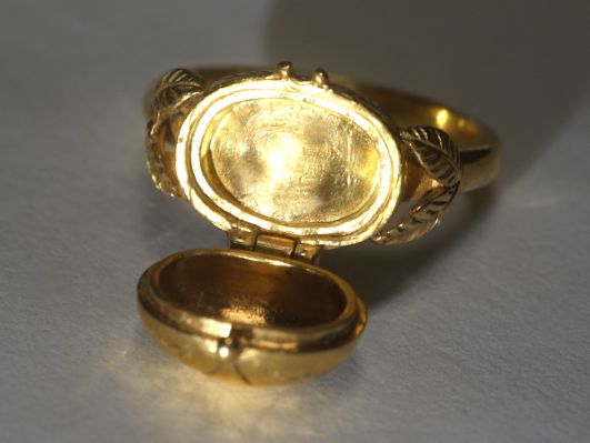 蓋が開閉できる小さなコンパートメントが特徴で、その中にはかつて、香料や薬、または暗い時代には毒さえも隠されたと言われています。