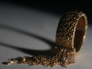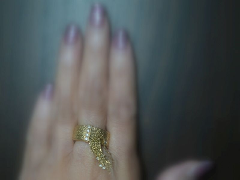 このリングの最大の特徴は、貴金属であるゴールドを、まるで上質なシルクやスカーフのようにしなやかな布の様に表現している点にあります。