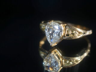 リングのデザインは、センターのティアドロップシェイプ(涙型)柔らかな曲線を、周囲の曲線的な彫り込みや、繊細な彫金。
