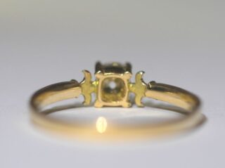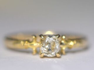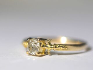 約0.45カラットダイヤモンドを支えるように控えめな輝きのゴールドの爪は、オールドマインカットダイヤを引き立てるようなシンプルな4本の爪のアンティークジュエリー。