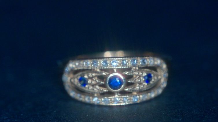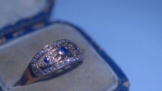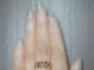 アールデコ時代のサファイアの周りに、透かしのローズカットダイヤモンドが囲んでいます。 豪華なデザインの指輪に、サファイアが覆輪留めで留められていてスッキリしています。