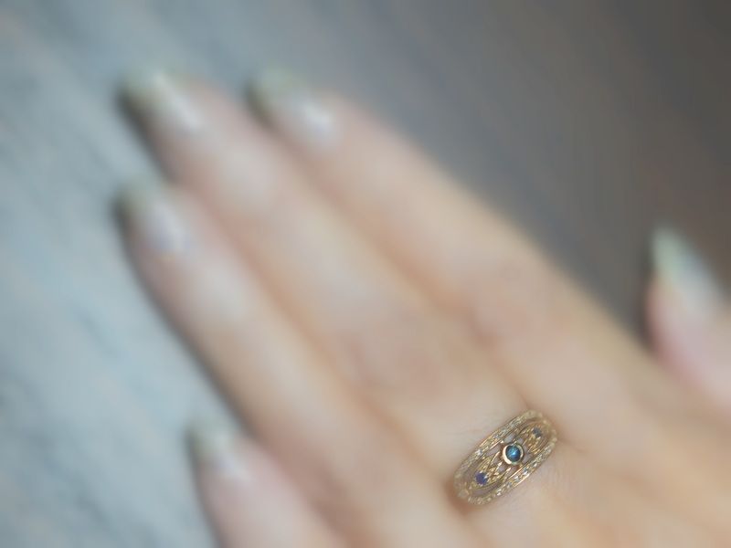 天然のサファイアは、永遠に続く人の理解を超えるブルーで、深い深い美しさ。 サファイアとローズカットダイヤモンドの指輪は、ヨーロッパの文化と歴史を、感じさせられる。