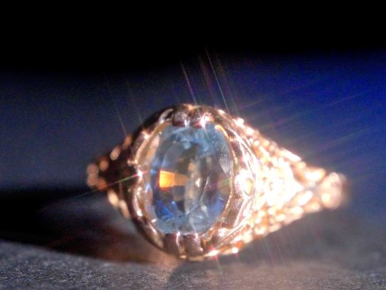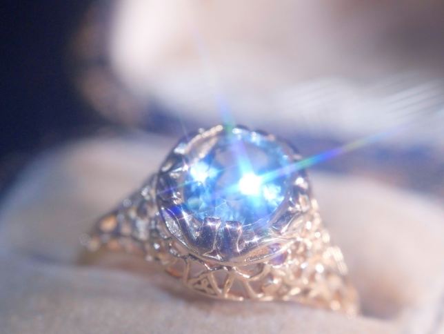 水の雫のような、約1.5カラットのアクアマリンは、爪が4つで飾り細工で額縁の様に彫金が施されています。