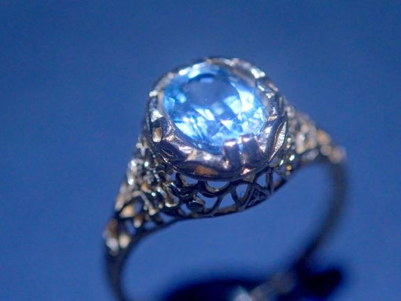 約1.5カラットの、アクアマリン、アールデコ時代の淡いブルーと上品な透かし細工が楽しめるアンティークジュエリー。