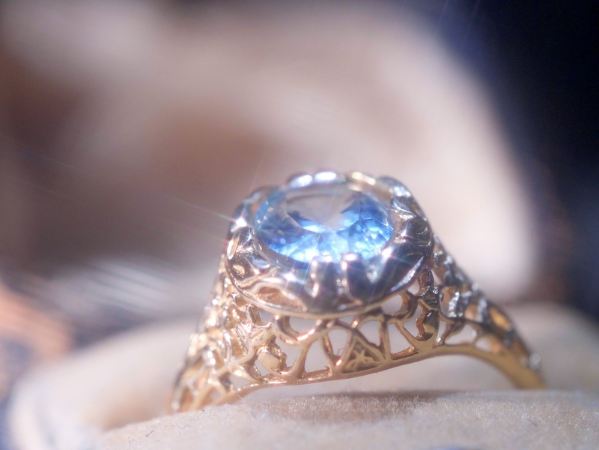アールデコの、約1.5カラットもあるラウンドカットアクアマリンを使用した、フィリグリーのお花と葉っぱの透かし金細工リングです。