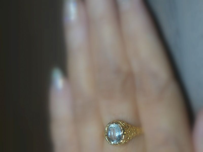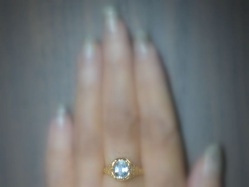 アクアマリンと、ゴールドの彫金のセッティングや、魅力の詰まったリングです。