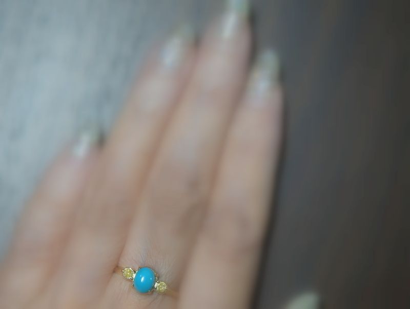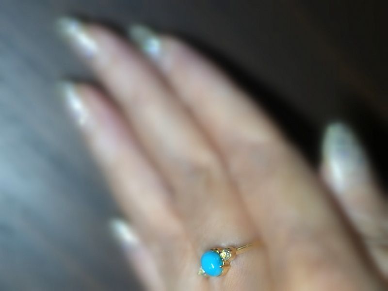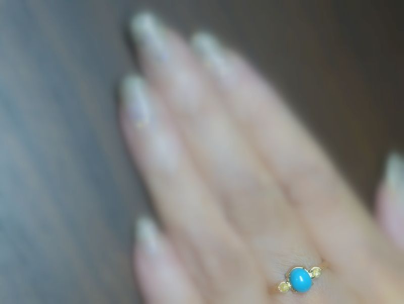 これだけの上質の約1カラットトルコ石と、合計2石約0.2カラットダッチローズカットダイヤモンドの指輪がこの価格なのは、良心的なです。