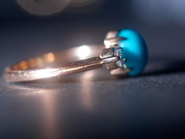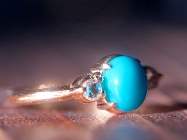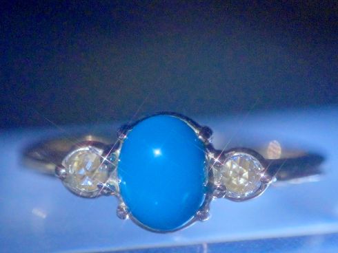 約1カラットトルコ石と、合計2石約0.2カラットダッチローズカットダイヤモンドの美しい指輪は、アンティークジュエリーがお好きな人なら一つは欲しいと思うジュエリーの一つ。