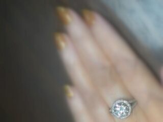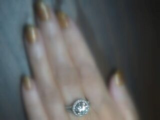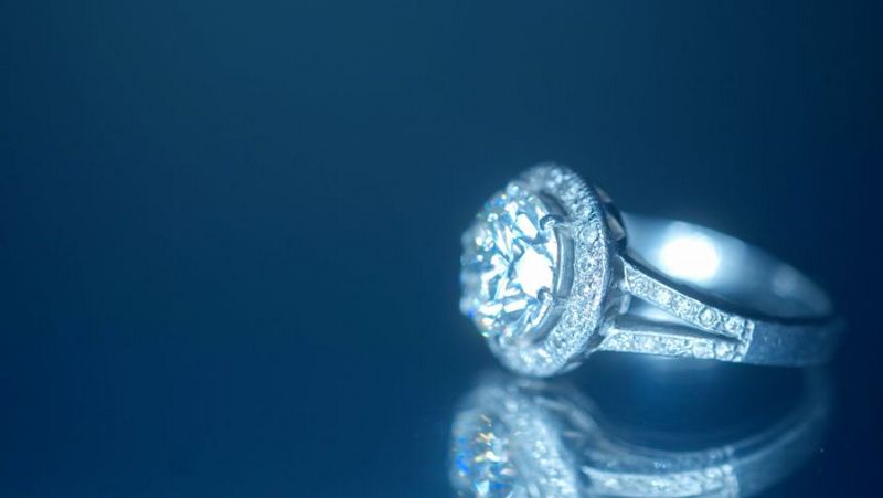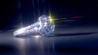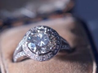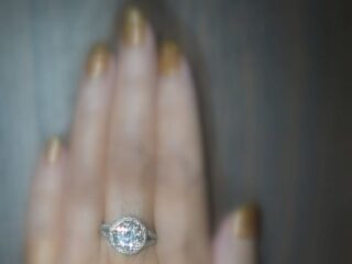 正面にはブリリアントカットダイヤモンドが、周りには小さなブリリアントカットダイヤモンドが丁寧にセットされています。