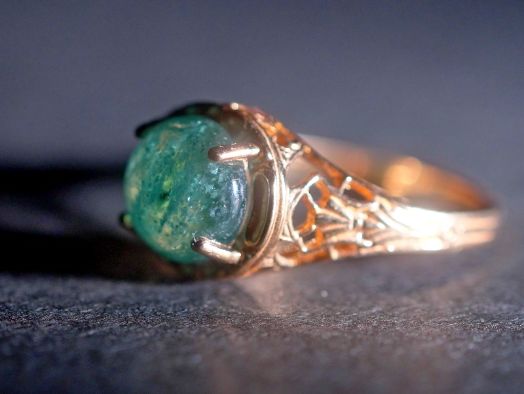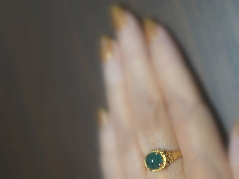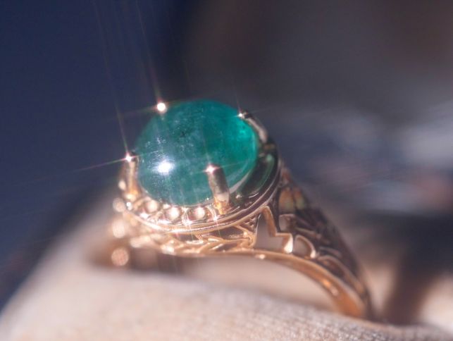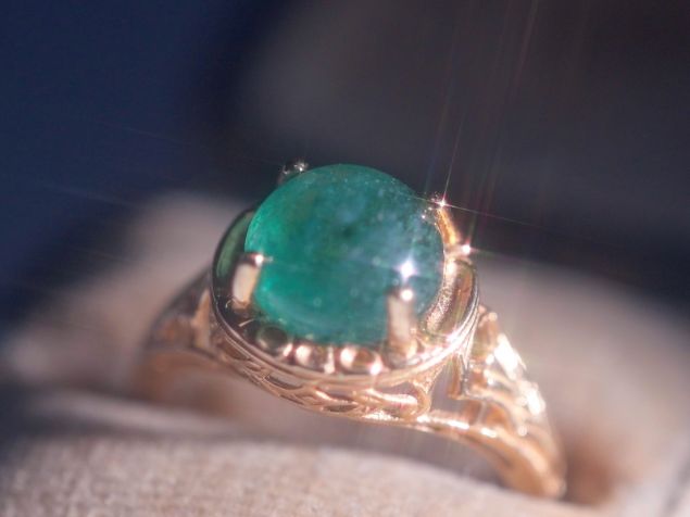 約3カラットのカボションカットエメラルドの、フィリグリーの繊細な透かしが施されたリングです.