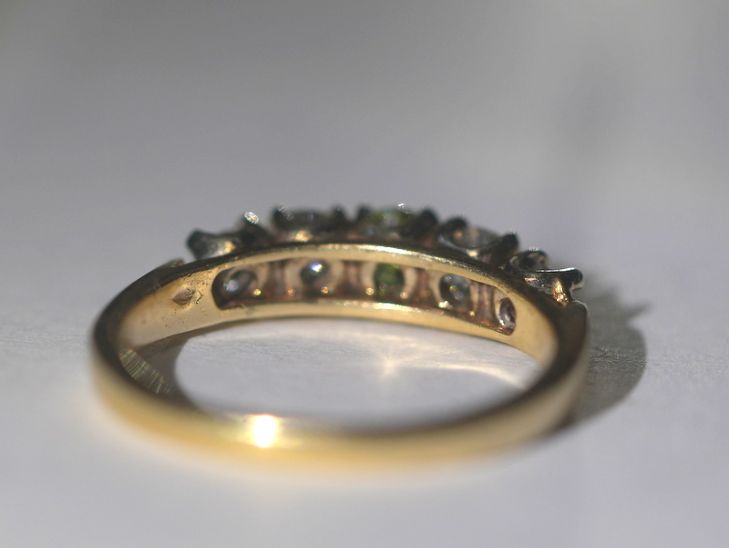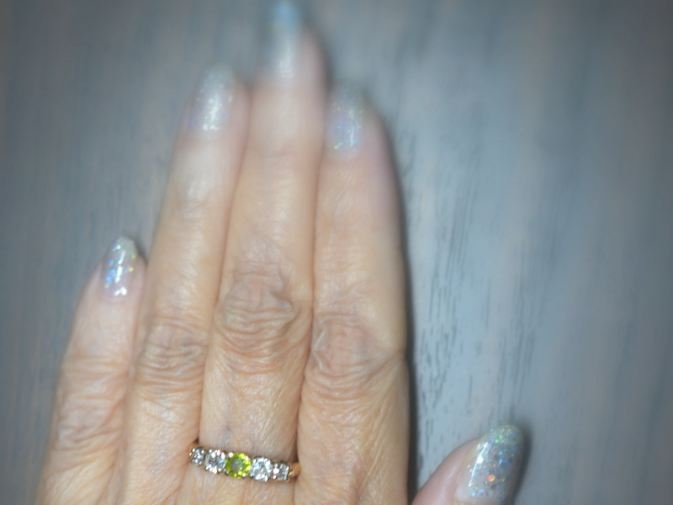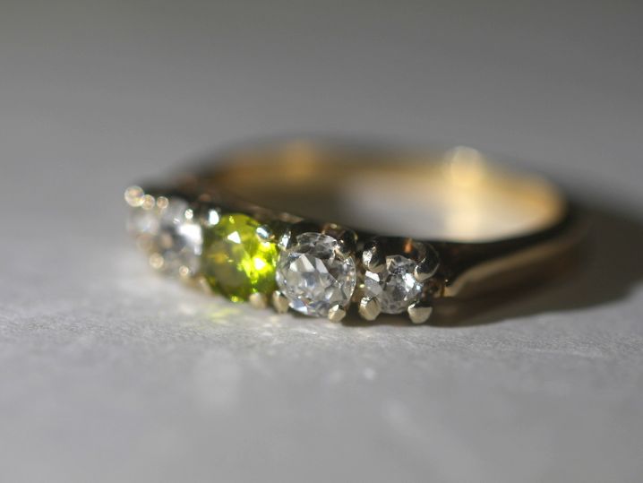 シャンクもしっかりした横幅があり贅沢で、シャープで美しいラインの、 5石宝石を横一列に並べた指輪。
