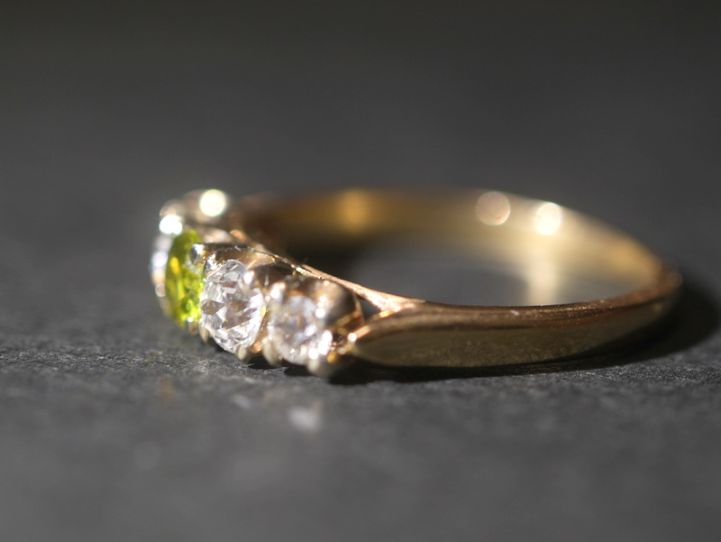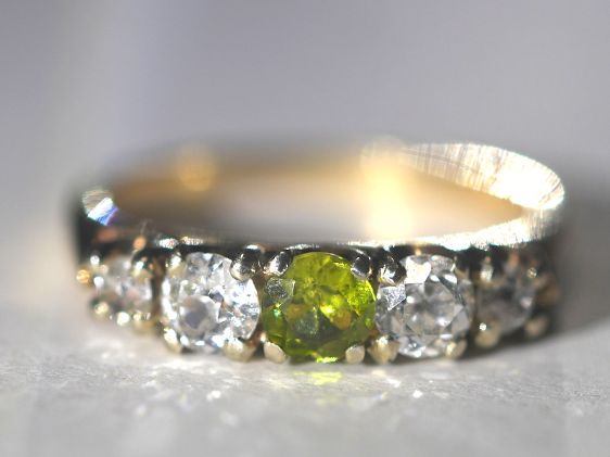 アールヌーヴォーの、優しくエレガントなリングで、他にない価値は、約0.45カラットデマントイドガーネットと、合計4石の約1カラットオールドマインカットダイヤモンド。