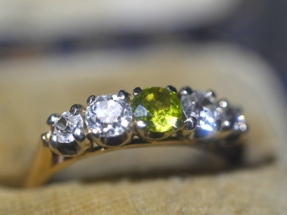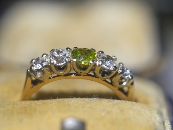 約0.45カラットの、デマントイドガーネットと、合計4石約1カラットのオールドマインカットダイヤモンド、この価格は超お買い得です。