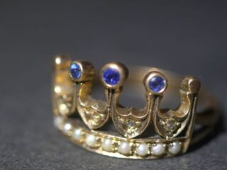 是非、魅力的なデザインが特徴の、 合計3石約0.25ctサファイア 合計4石約0.15ctローズカットダイヤモンド 9粒シードパールの王冠指輪をお楽しみ下さい。