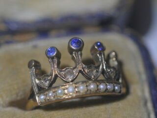 ゴールドで、サファイアと、ローズカットダイヤモンドと、シードパールの色にとてもよくあっているアンティークジュエリー。
