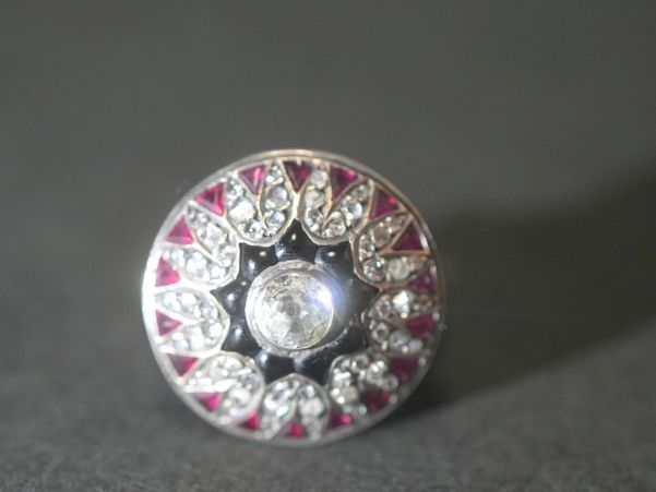 アールデコ55石約1.5CTオールドマイン&ローズカットダイヤモンド&約1CTルビー&約0.45CTオニキスカクテルリング(鑑定書付)【ra143】