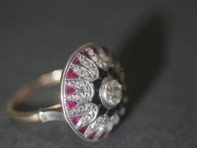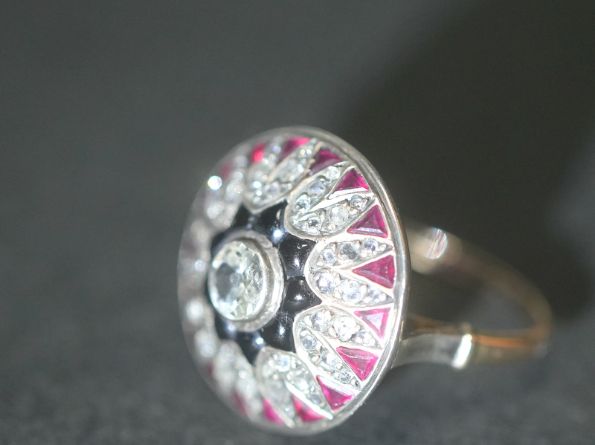 オールドマインカットダイヤモンドは、ホワイトゴールドのベゼルにセットされていて、 ダイヤモンドのキラキラとした輝きと、オニキスと、ルビーの美しい色彩のコントラストが魅惑的なアールデコの指輪です。