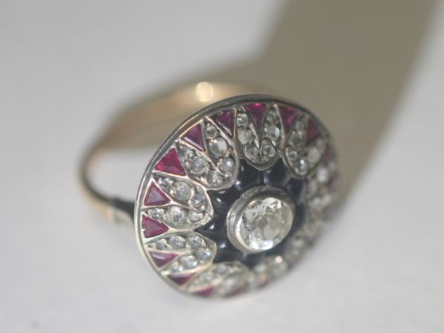 赤色のルビー、オールドマイン&ローズカットダイヤモンドとカボションカットオニキスを、巧みに組み合わせたデザインのアンティークジュエリー。