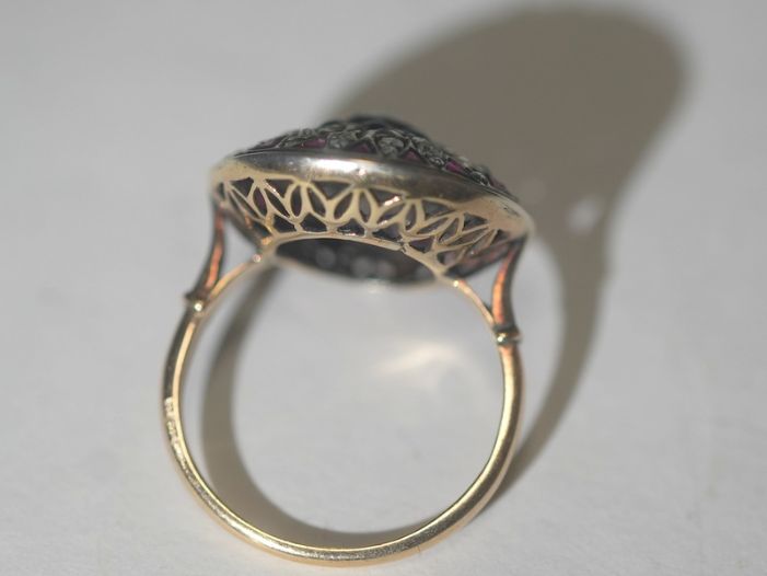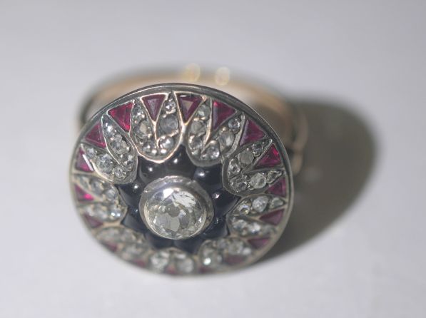 合計55石約1.5カラットのオールドマイン&ローズカットダイヤモンドと、合計18石約1カラットのルビーと、合計9石約0.45カラットオニキスが、セッティングされた洗練された雰囲気ある指輪です。