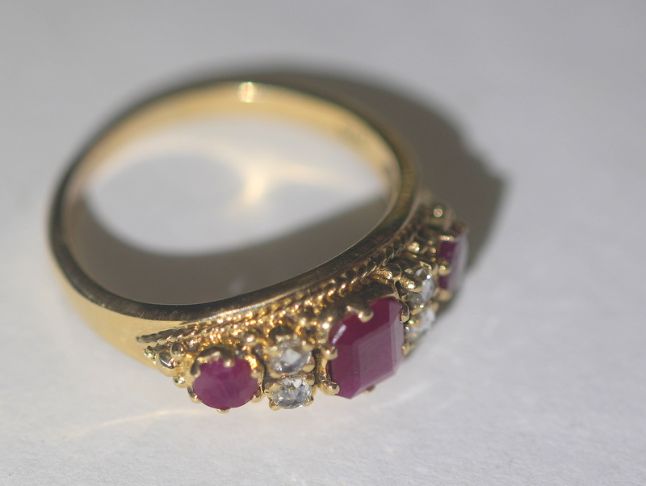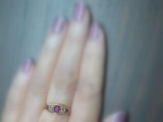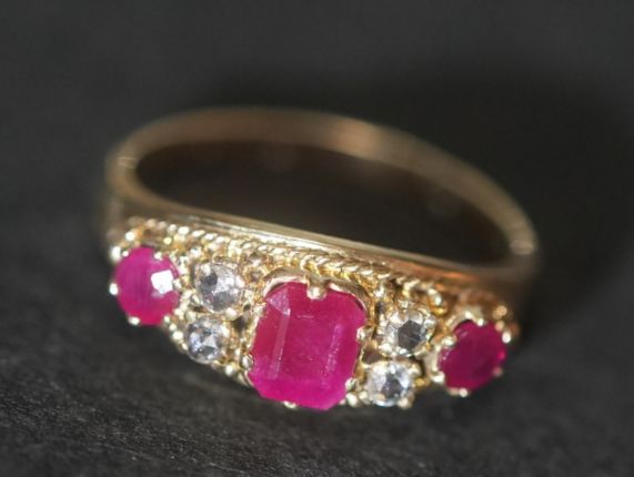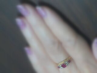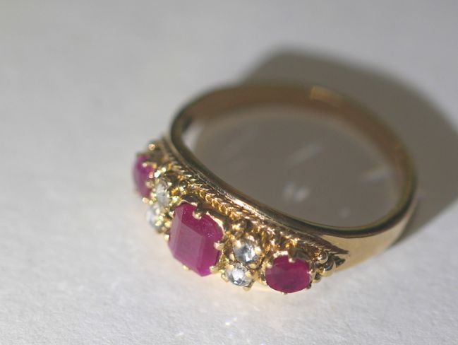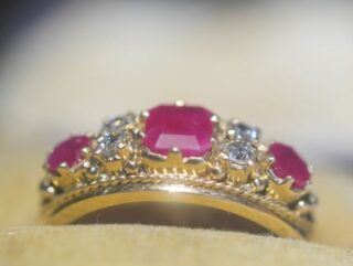 合計4石約0.3カラットの、ローズカットダイヤモンドが綺麗に輝き、約0.9カラットの、合計3石ルビーを引き立てているようです。