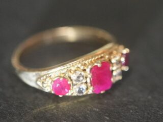 横に並んだデザインは、ルビーを中心に置き、ローズカットダイヤモンドを周りに4石もあしらった、とても洗練された雰囲気の指輪です。