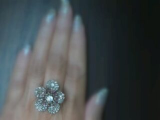 中央のオールドマインカットの周囲を取り囲むダイヤモンドは、まるで精緻なアートワークのように配置され。