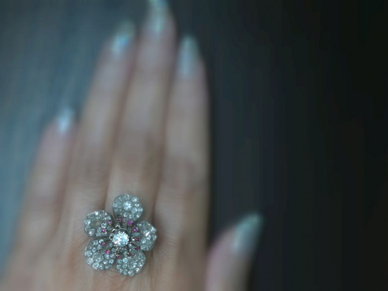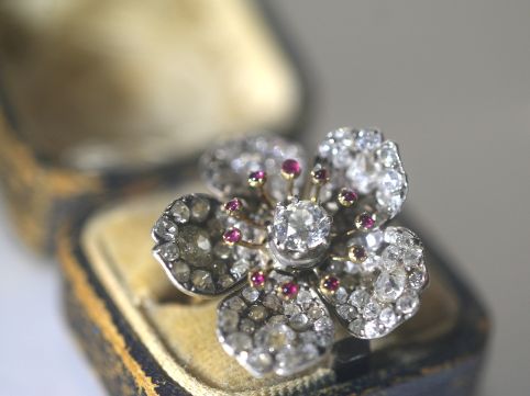 アールヌーヴォー約5ct109石オールドマインカットダイヤ&カボションルビーお花のリング(鑑定書付)【ra153】