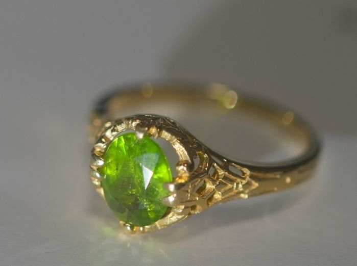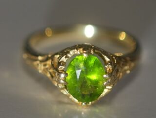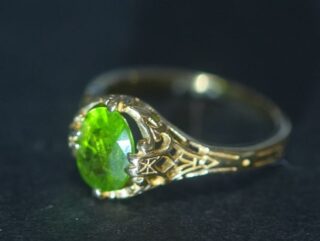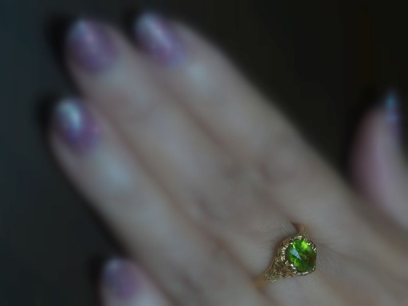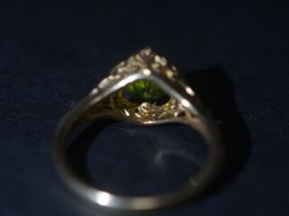 約1.5カラットという存在感を放つ、デマントイドガーネットを主役に据えたアールヌーヴォーリング。
