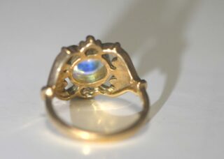 9金ゴールドの柔らかな色味は、ブルームーンストーンの青白い光と美しく調和し、全体にアンティークならではの温もりを添えています。