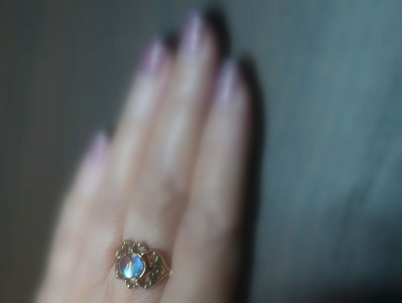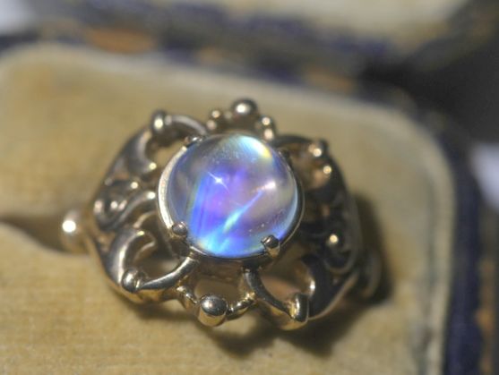 9金ゴールドの柔らかな色味は、ブルームーンストーンの青白い光と美しく調和し、全体にアンティークならではの温もりを添えています。