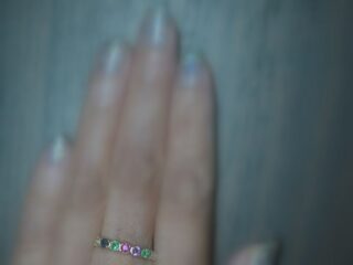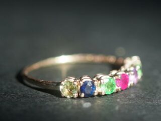 肌に馴染む淡いシャンパンゴールドの色合いが、鮮やかな7色の宝石たちを優しく包み込みます。