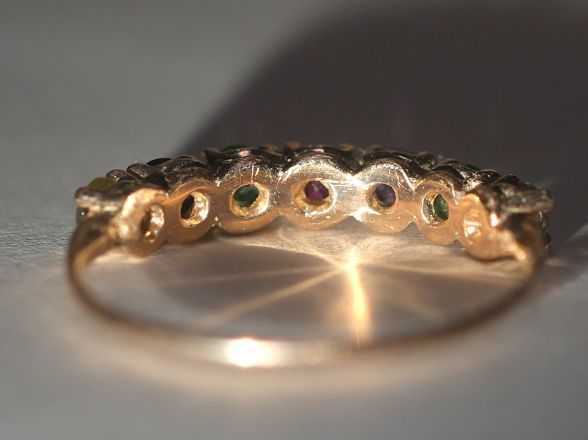 19世紀の英国で愛する人へ贈られたアクロスティックジュエリー(石の名前の頭文字でメッセージを伝える宝飾品)の中でも、最も美しく、最も情熱的な意味を持つDEAREST(ディアレスト)リングです。